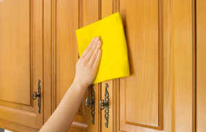 Жирные пятна могут появиться практически везде, но в основном на кухне. Чтобы очистить шпонированную мебель от такого рода загрязнений, используйте специальное средство для удаления жира. Просто смочите в нем губку или тряпку и нанесите его на испачканный участок, аккуратно потирая, пока пятно не будет удалено. Вы также можете использовать жидкость для мытья посуды, растворенную в теплой воде. Чистить шпонированную кухонную мебель следует регулярно, в идеале - раз в два-три месяца.